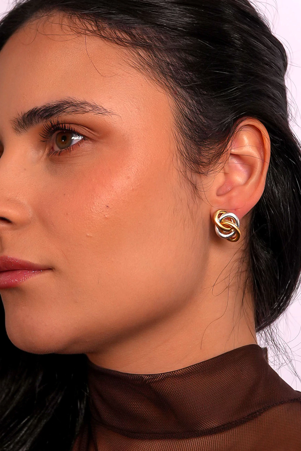 Mix de banhos dourado e ródio, acabamento fosco, design entrelaçado.