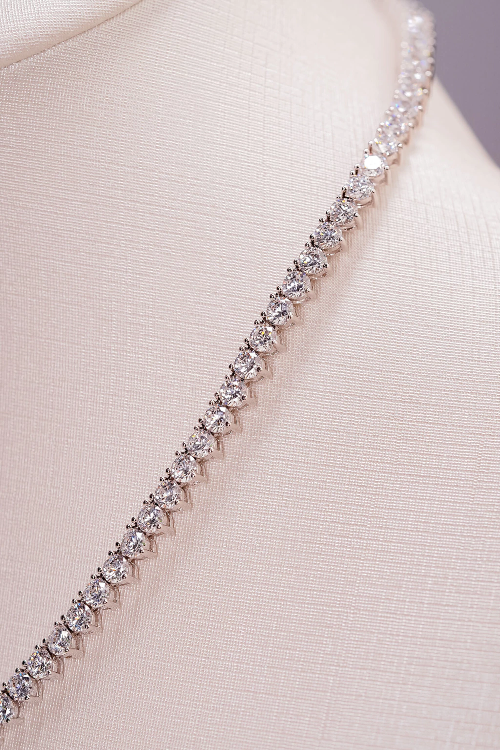 Zircônias 3 mm em lapidação brilhante, cravação 3 garras, banho ródio branco, acabamento polido, comprimento 40 cm, modelo riviera.